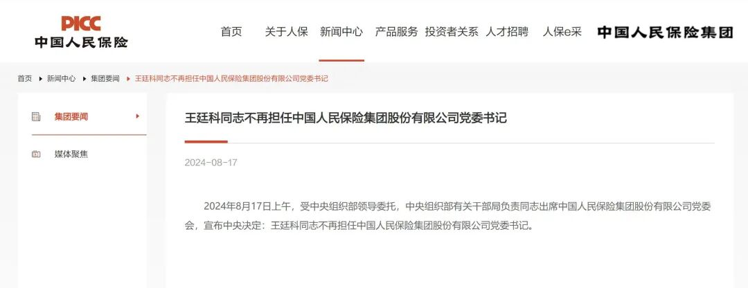 据中国人保集团官网信息,8月17日上午,受中央组织部领导委托,中央组织部有关干部局负责同志出席中国人民保险集团股份有限公司党委会,宣布中央决定:王廷科同志不再担任中国人民保险集团股份有限公司党委书记。
