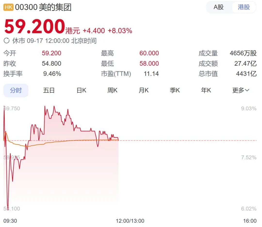 9月17日,美的集团(00300.HK)正式在港交所挂牌上市,开盘即高开,早盘股价涨幅达到8.03%。