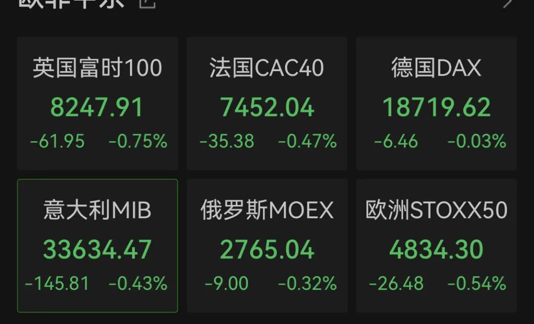欧洲方面,英、法、德三国重要股指纷纷飘绿。