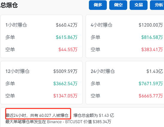 比特币方面,在经历前两天的上涨之后,也出现跳水,Coinglass数据显示,过去24小时之内,虚拟货币有超6万人爆仓。