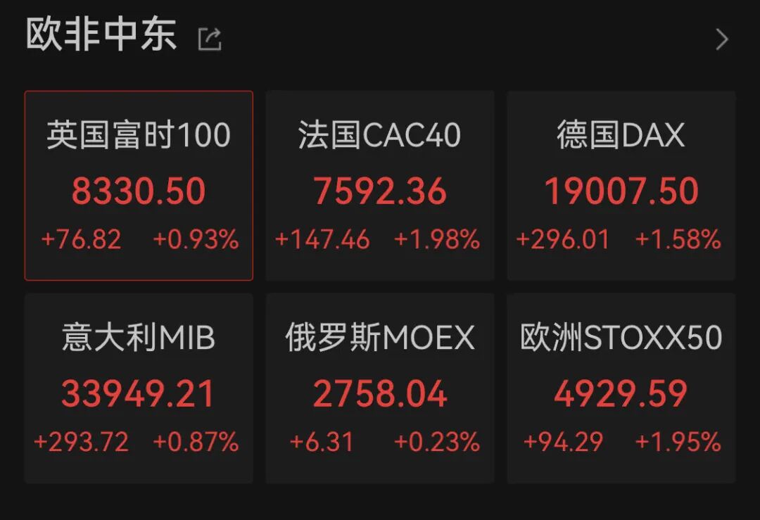 欧洲方面,英法德三大指数均在大幅上涨。