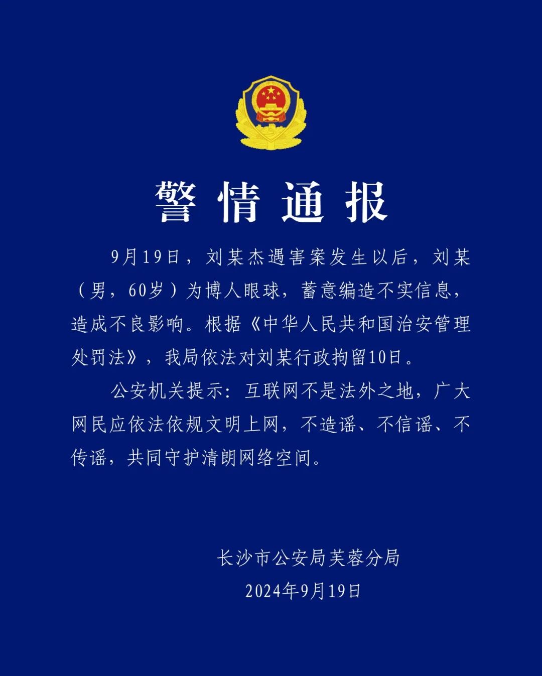 长沙警方:刘某杰遇害案发生后,刘某蓄意编造不实信息被行拘10日