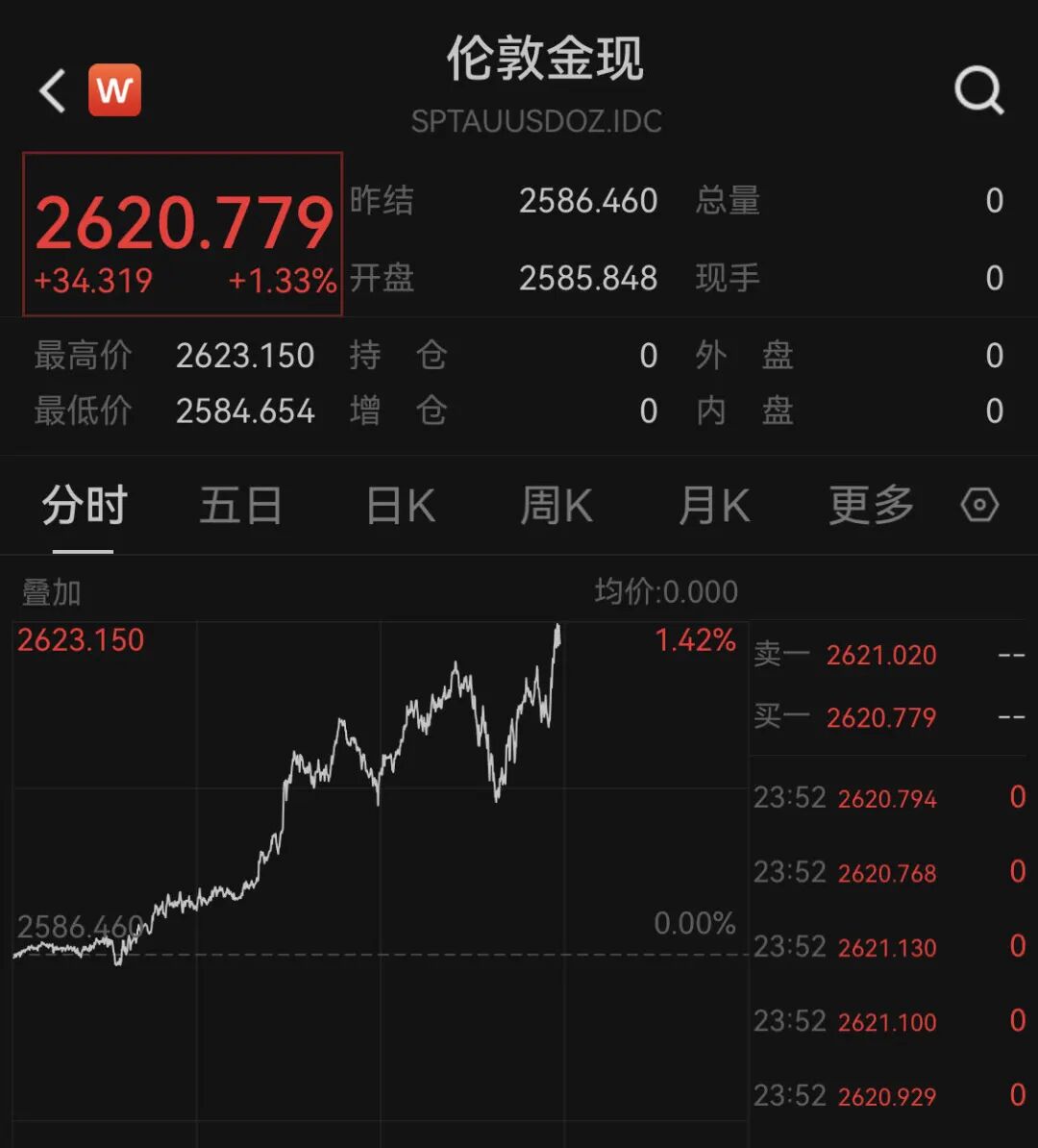 而现货黄金站上2620美元/盎司,再创历史新高,日内涨超1.3%。