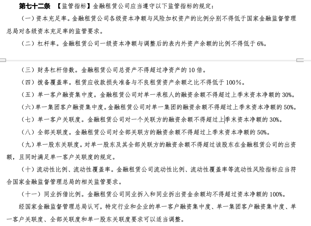 在监管层面,《办法》新增了杠杆率及财务杠杆倍数,租赁应收款拨备率、流动性比例、流动性覆盖率等指标,同时,还对拨备覆盖率和同业拆借比例监管指标进行了优化。
