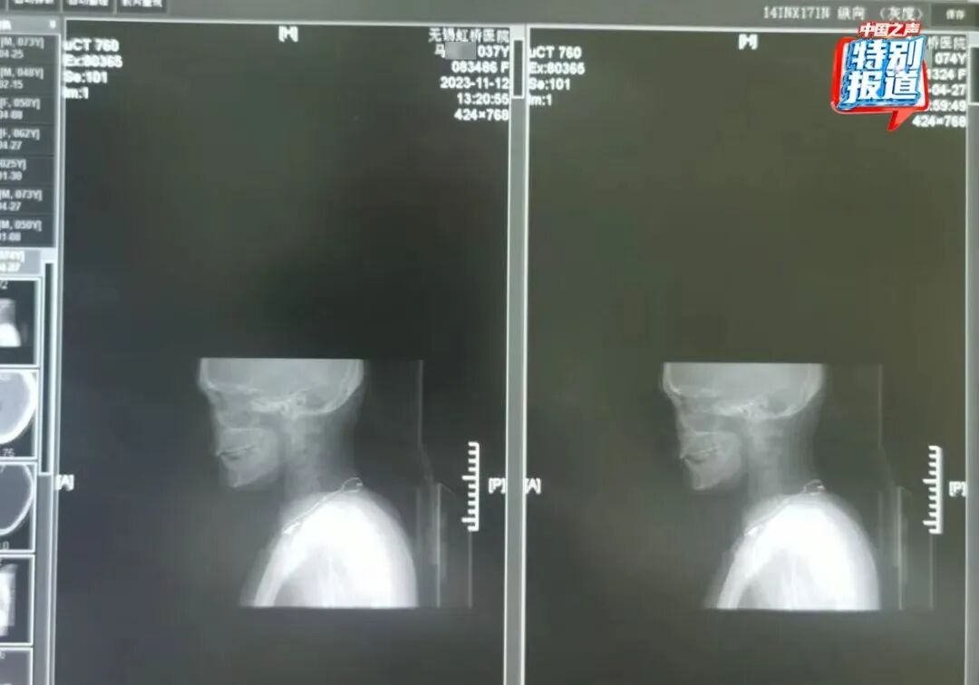 74岁的患者莫某在2023年4月27日拍摄了胸部和颈椎的CT,她的片子看起来和实际患者37岁的马某某在2023年11月拍的片子高度相似,片子里能直观看到项链都一模一样。