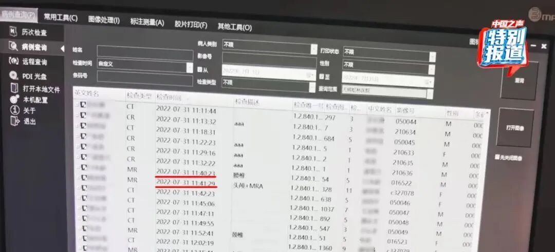 随后朱成刚带记者来到放射影像科办公室,记者看到系统内被举报的病历都已无法打开。