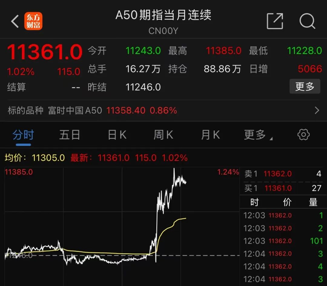 早间,A50期货指数直线拉升,截至发稿涨幅为1.02%。