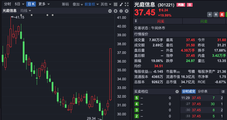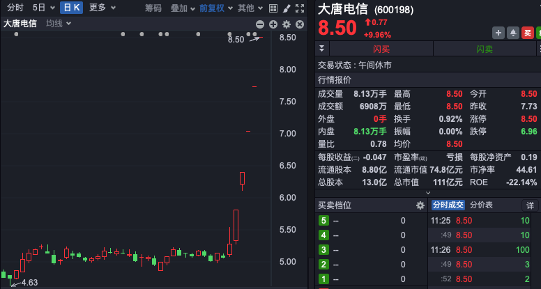 大唐电信一字涨停,连续第5日涨停,股价创近2年半来新高;国华网安同样一字涨停,连续第4日封板;卓朗科技亦开盘涨停,连续第3日封板;恒为科技等逾10股纷纷强势涨停或涨超10%。
