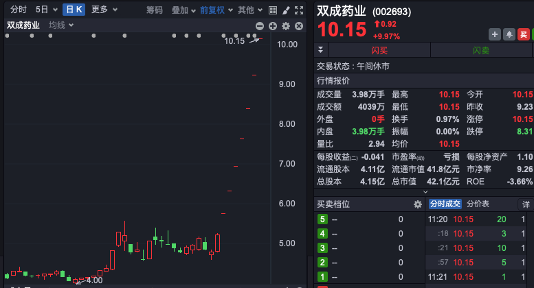 睿智医药仅约8分钟就20%涨停,双成药业则连续第7日一字涨停,河化股份、百花医药等亦强势封板。