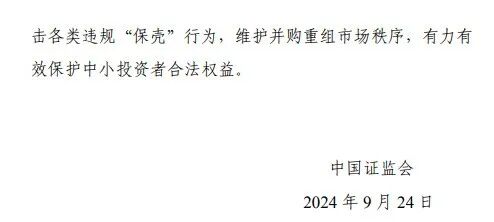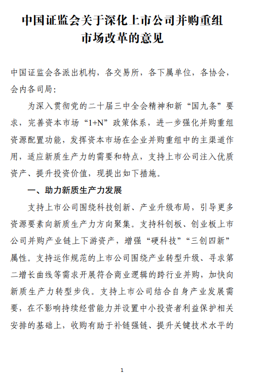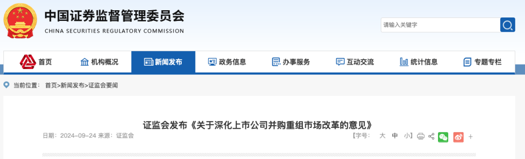 9月24日,证监会发布《关于深化上市公司并购重组市场改革的意见》。