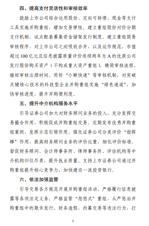 四是提升重组市场交易效率。证监会将支持上市公司根据交易安排,分期发行股份和可转债等支付工具、分期支付交易对价、分期配套融资,以提高交易灵活性和资金使用效率。同时,建立重组简易审核程序,对符合条件的上市公司重组,大幅简化审核流程、缩短审核时限、提高重组效率。