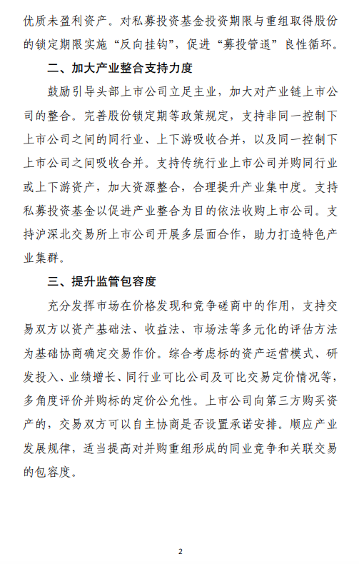 二是鼓励上市公司加强产业整合。资本市场在支持新兴行业发展的同时,将继续助力传统行业通过重组合理提升产业集中度,提升资源配置效率。对于上市公司之间的整合需求,将通过完善限售期规定、大幅简化审核程序等方式予以支持。同时,通过锁定期“反向挂钩”等安排,鼓励私募投资基金积极参与并购重组。
