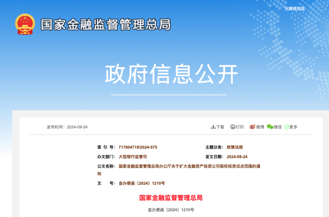 9月24日,国家金融监督管理总局办公厅发布关于扩大金融资产投资公司股权投资试点范围的通知。