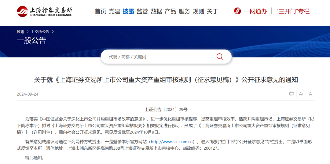 上交所发布关于就《上海证券交易所上市公司重大资产重组审核规则(征求意见稿)》公开征求意见的通知。