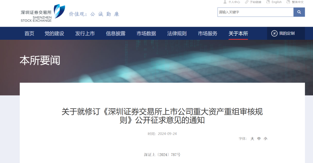 9月24日,深交所发布关于就修订《深圳证券交易所上市公司重大资产重组审核规则》公开征求意见的通知。