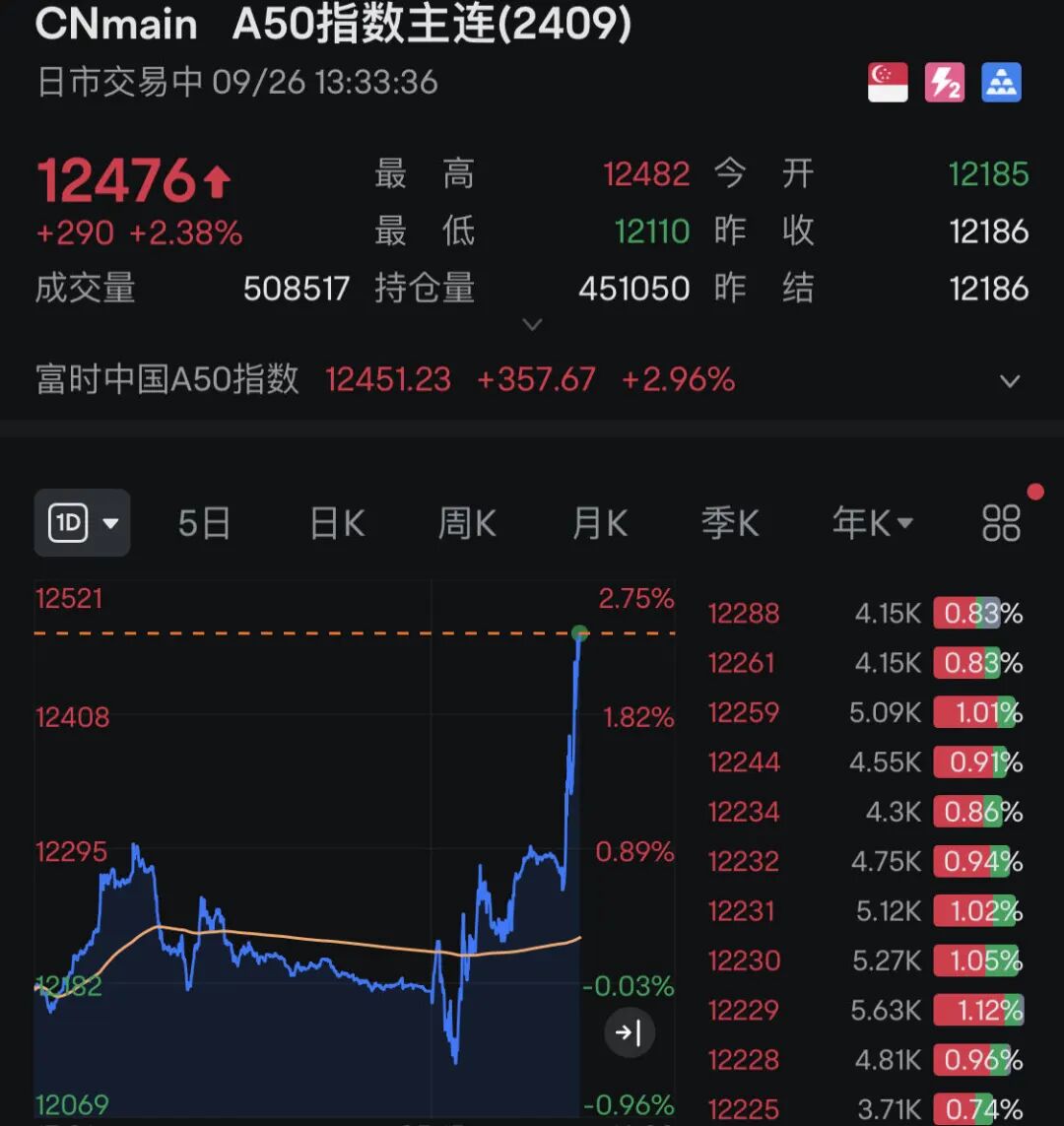 富时中国A50指数期货也直线涨超2%。