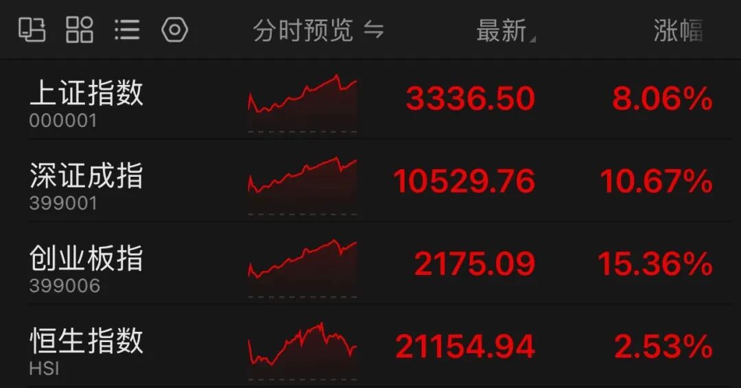 今日,A股在上周末连续重磅政策落地刺激下,加速上涨,科创50指数飙升17.88%,创业板指大涨15.36%,均创历史最高涨幅;上证指数则开盘即站上3100点,并连续突破3200点、3300点整数关口,深证成指也成功收复10000点大关,双双创1年多来新高。