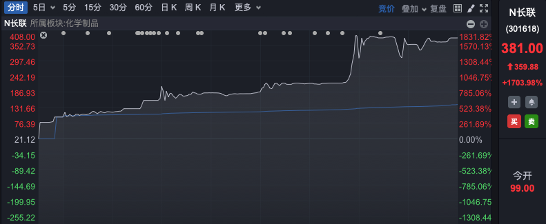 受市场狂热气氛带动,今日上市新股长联科技暴涨,盘中两度临停,都未能阻止其上涨的部分,盘中最高摸至408元,涨1832%。截至收盘,涨幅略有回撤,但仍飙升1704%。如按最高价计算,中一签可盈利19.34万元,为年内最赚钱新股。