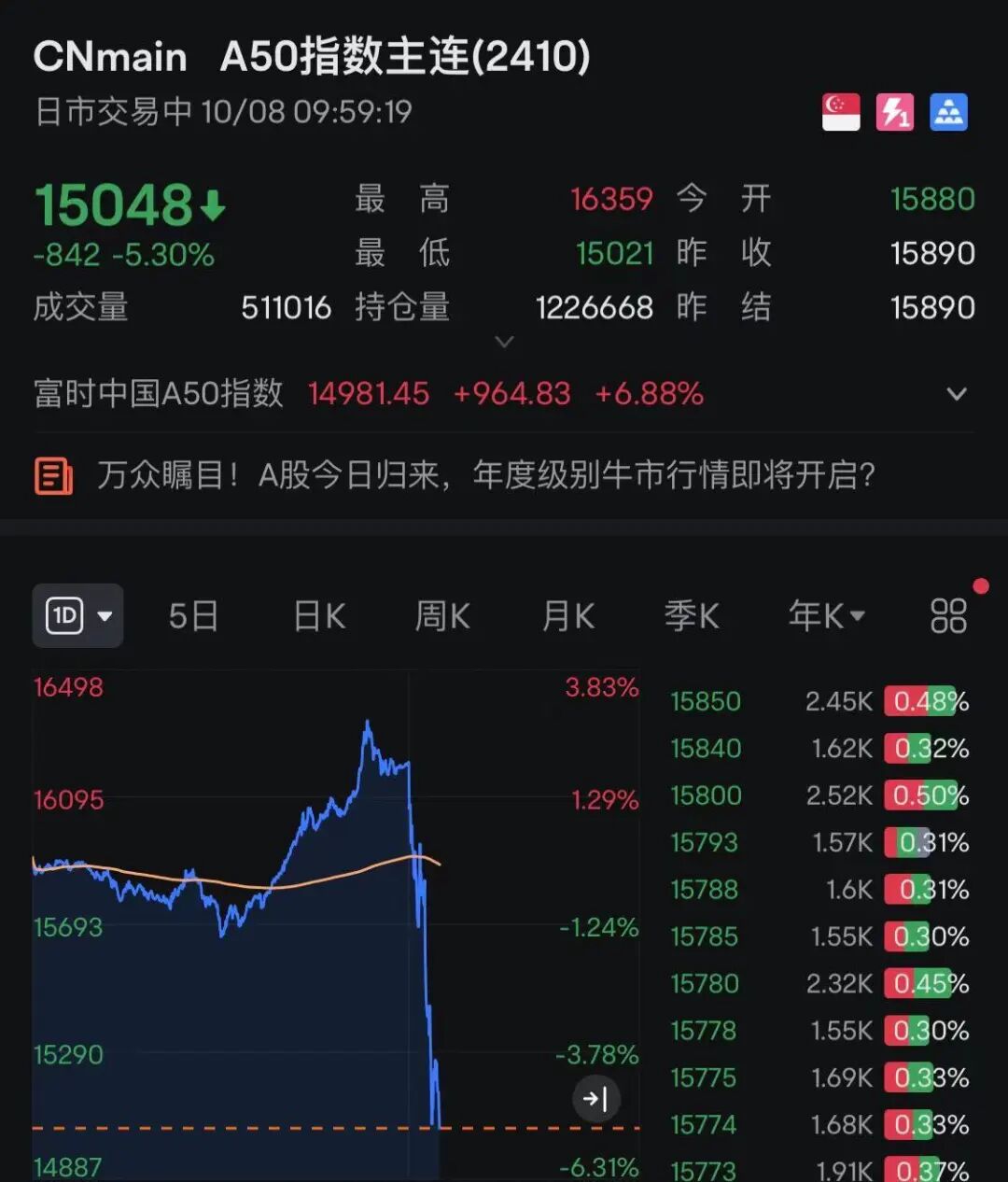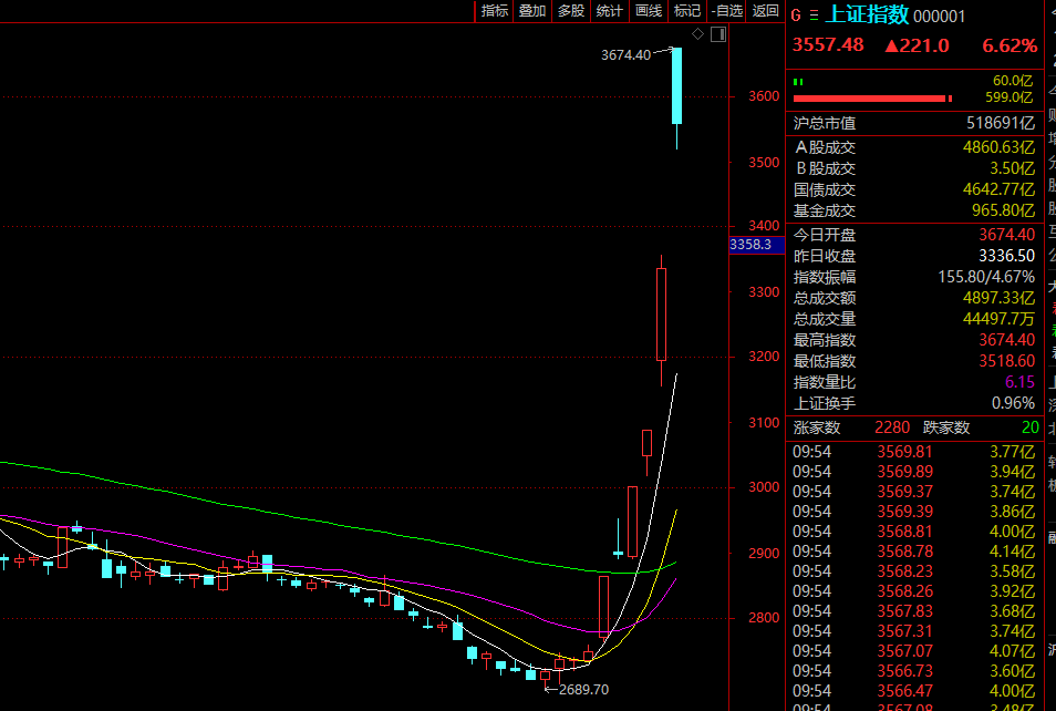早间,A股大幅高开后回落,截至发稿,上证指数涨超7%。截至9时52分,沪深两市成交额突破1万亿元,刷新历史最快万亿纪录。