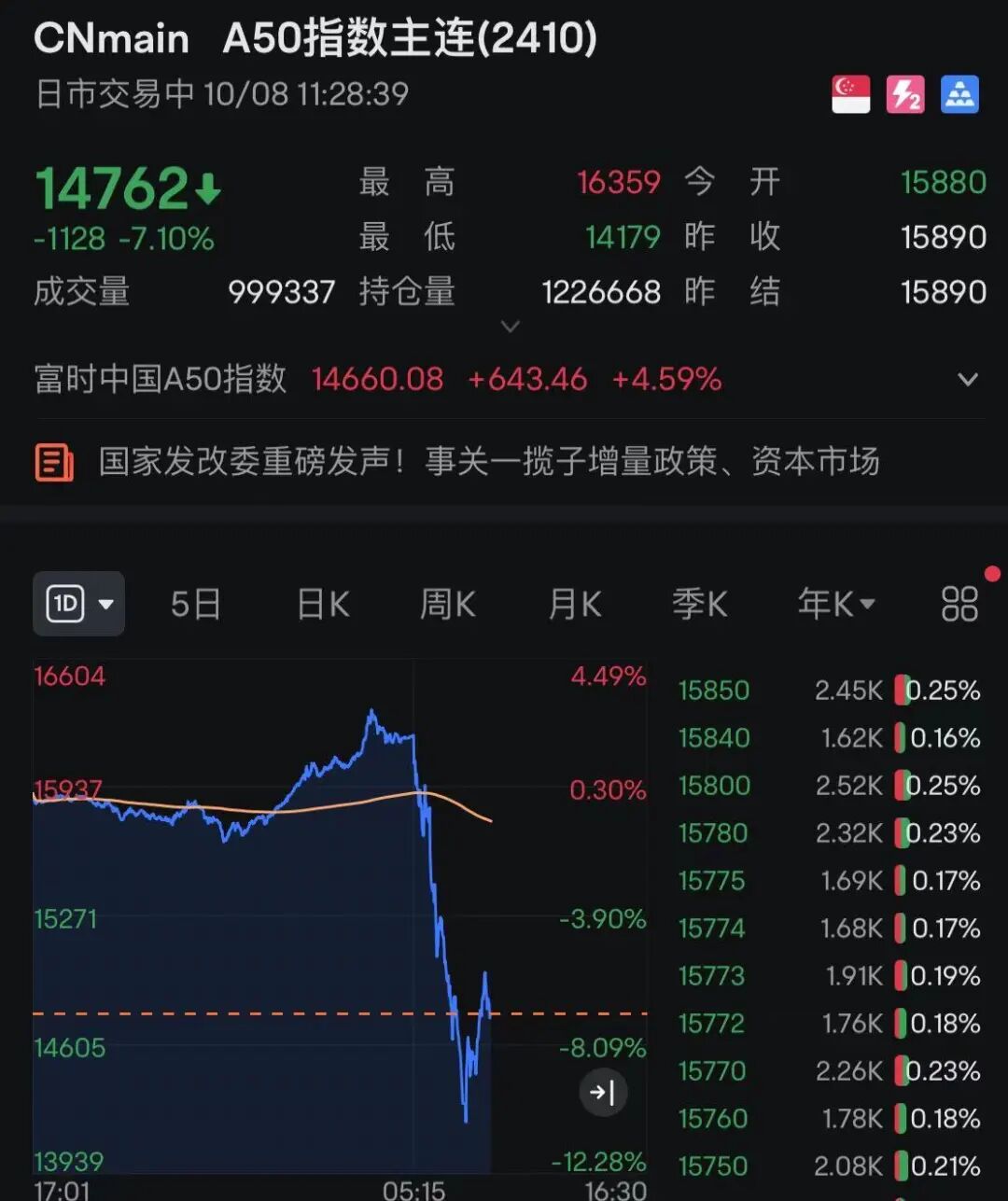 富时中国A50指数期货主力合约跌幅也一度超过10%。