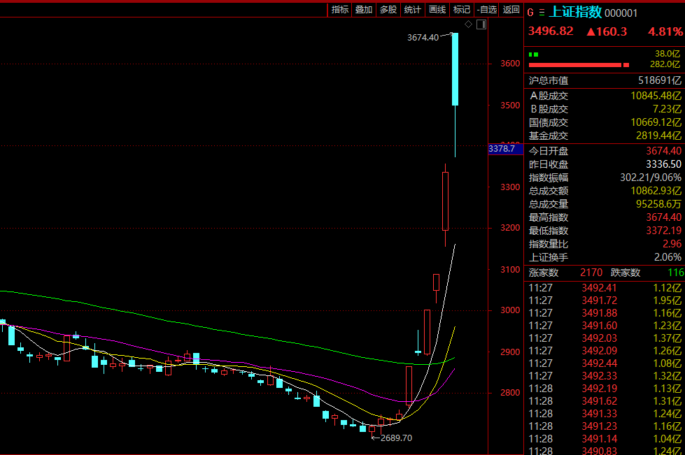 今日早盘,A股不出意外的大幅高开,多项历史纪录被刷新。上证指数直接开在3600点之上,大涨10.13%,这是上证指数历史首次涨幅超过10%;深证成指高开12.67%,创业板指高开18.44%。