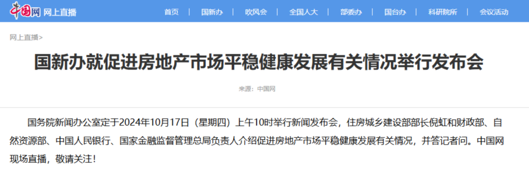 10月15日晚,国务院新闻办公室发布消息:定于2024年10月17日(星期四)上午10时举行新闻发布会,住房城乡建设部部长倪虹和财政部、自然资源部、中国人民银行、国家金融监督管理总局负责人介绍促进房地产市场平稳健康发展有关情况,并答记者问。