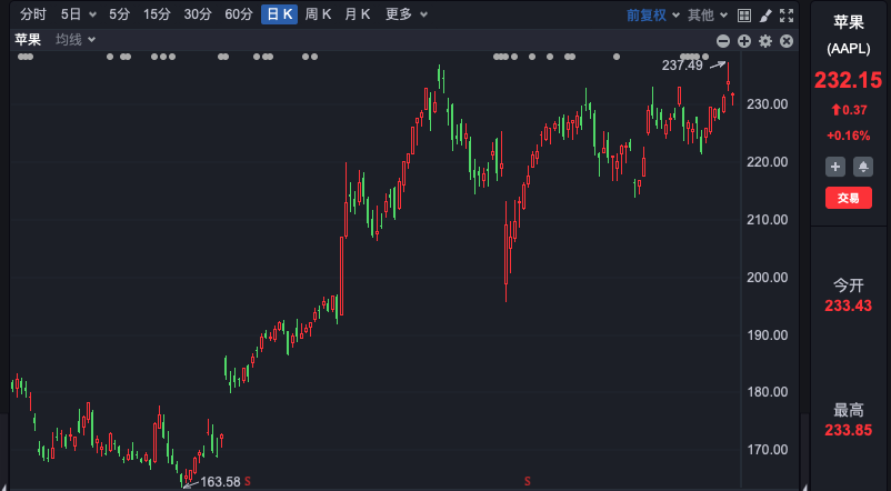 苹果股价今年以来累计上涨20%,在10月15日创下237.49美元/股的历史新高后,最近几个交易日一直维持高位震荡。