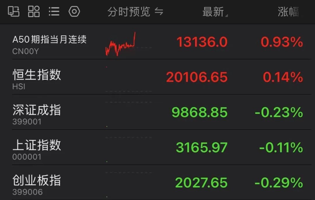 10月18日,富时中国A50指数期货高开并直线拉升,截至发稿最新涨幅为0.81%,香港股市亦高开。A股三大指数略微低开。