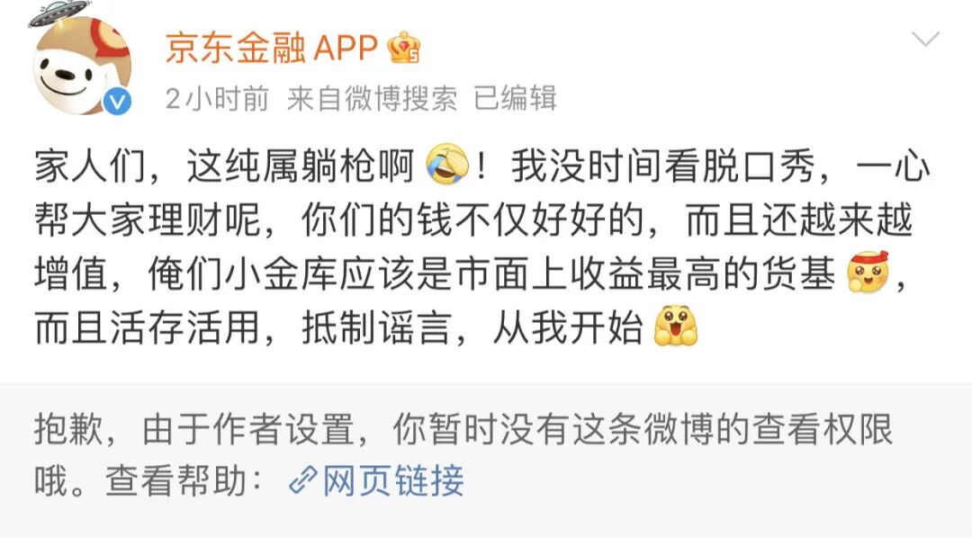 京东金融还在微博发文回应了网传消息,表示“纯属躺枪”“抵制谣言,从我开始”。