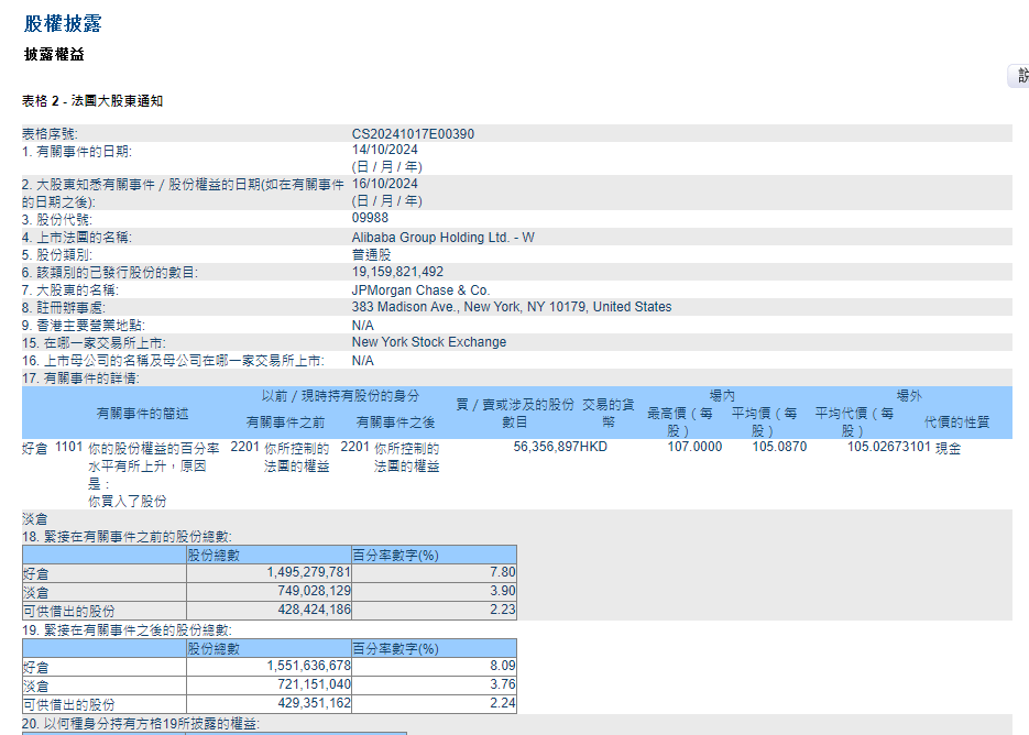 10月18日晚间,香港联交所披露易数据显示,摩根大通于10月14日增持阿里巴巴-SW(09988)约5636万股,平均价格为105.0870港元,涉资约59.22亿港元(约54亿元人民币)。增持后持股数目为15.51亿股,持股比例由7.80%增至8.09%。