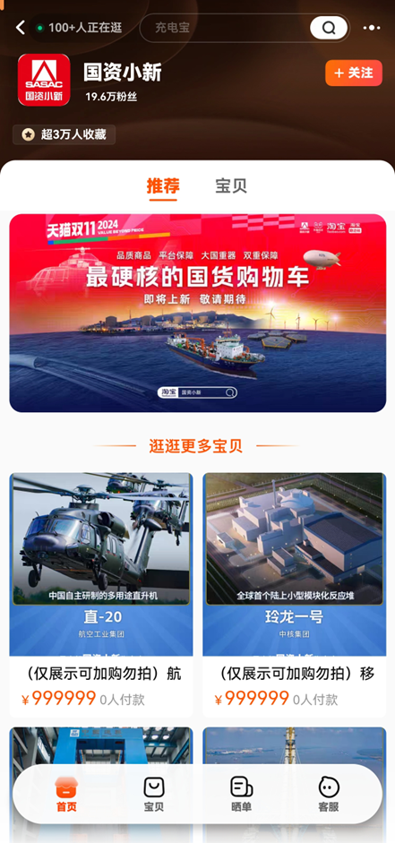 国资小新淘宝店负责人介绍,今年天猫“双11”,在淘宝继续展示中央企业既能打造大国重器“国家名片”,也有个别大国重器符合直接上架出售的条件。同时,一些央企会在国资小新淘宝店上架技术和材料过硬的“低调国货”,“主要是让大家感受到,大国重器既顶天立地、又能保障和改善民生的责任担当。