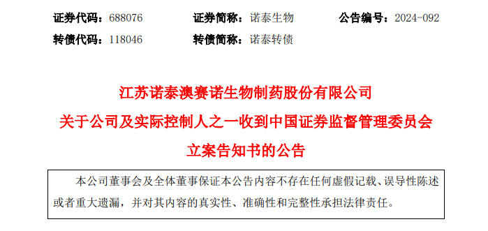 10月23日晚间,诺泰生物(688076)发布公告,近日收到中国证监会立案告知书,因涉嫌信息披露违法违规,公司及实控人之一赵德中被立案。