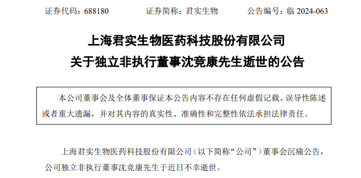 沈竞康担任君实生物独立非执行董事。10月23日晚间,君实生物董事会沉痛公告,公司独立非执行董事沈竞康先生于近日不幸逝世。