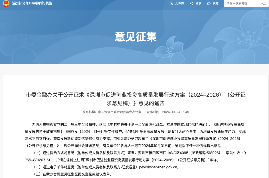 深圳市市委金融办发布关于公开征求《深圳市促进创业投资高质量发展行动方案(2024—2026)(公开征求意见稿)》意见的通告(下称《行动方案》)。