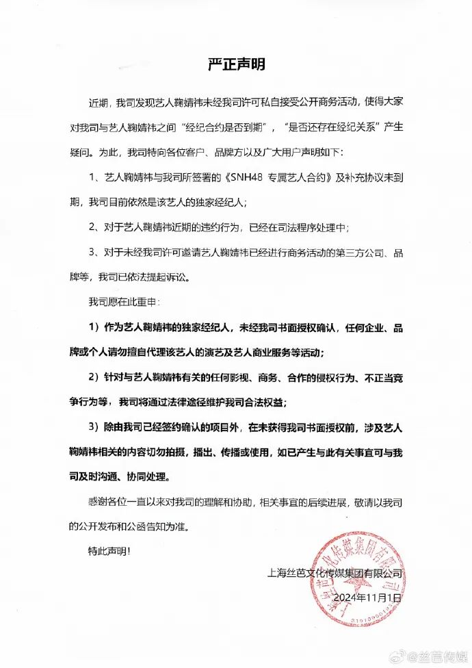 据了解,11月1日上午,丝芭传媒发布声明称,艺人鞠婧祎与公司所签署的《SNH48专属艺人合约》及补充协议未到期,丝芭传媒目前依然是鞠婧祎的独家经纪人,公司发现鞠婧祎未经许可私自接受公开商务活动,对于鞠婧祎的违约行为已在司法程序处理中,并对进行商务活动的第三方公司、品牌等提起诉讼。