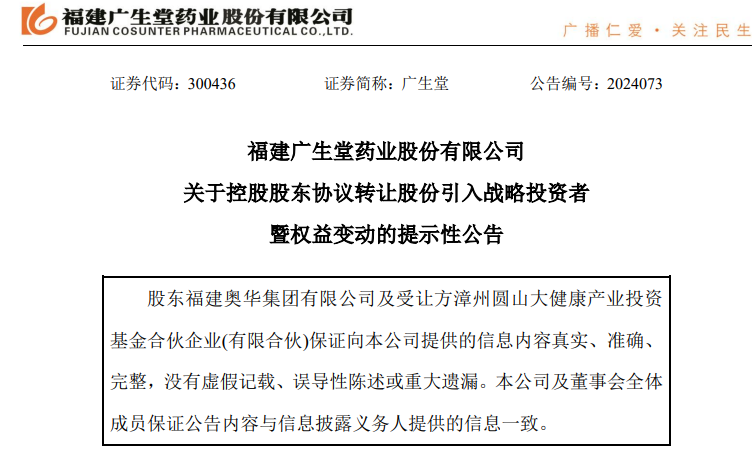 该公司11月15日晚间公告,为了进一步优化公司股东结构,引进长期看好公司发展的战略投资者,持有广生堂3506.87万股股份(占上市公司总股本比例22.02%)的控股股东福建奥华集团有限公司(下称“奥华集团”)将其持有公司的无限售流通股800万股(占公司总股本的5.02%)以协议转让的方式转让给漳州圆山大健康产业投资基金合伙企业(有限合伙)(下称“圆山基金”)。