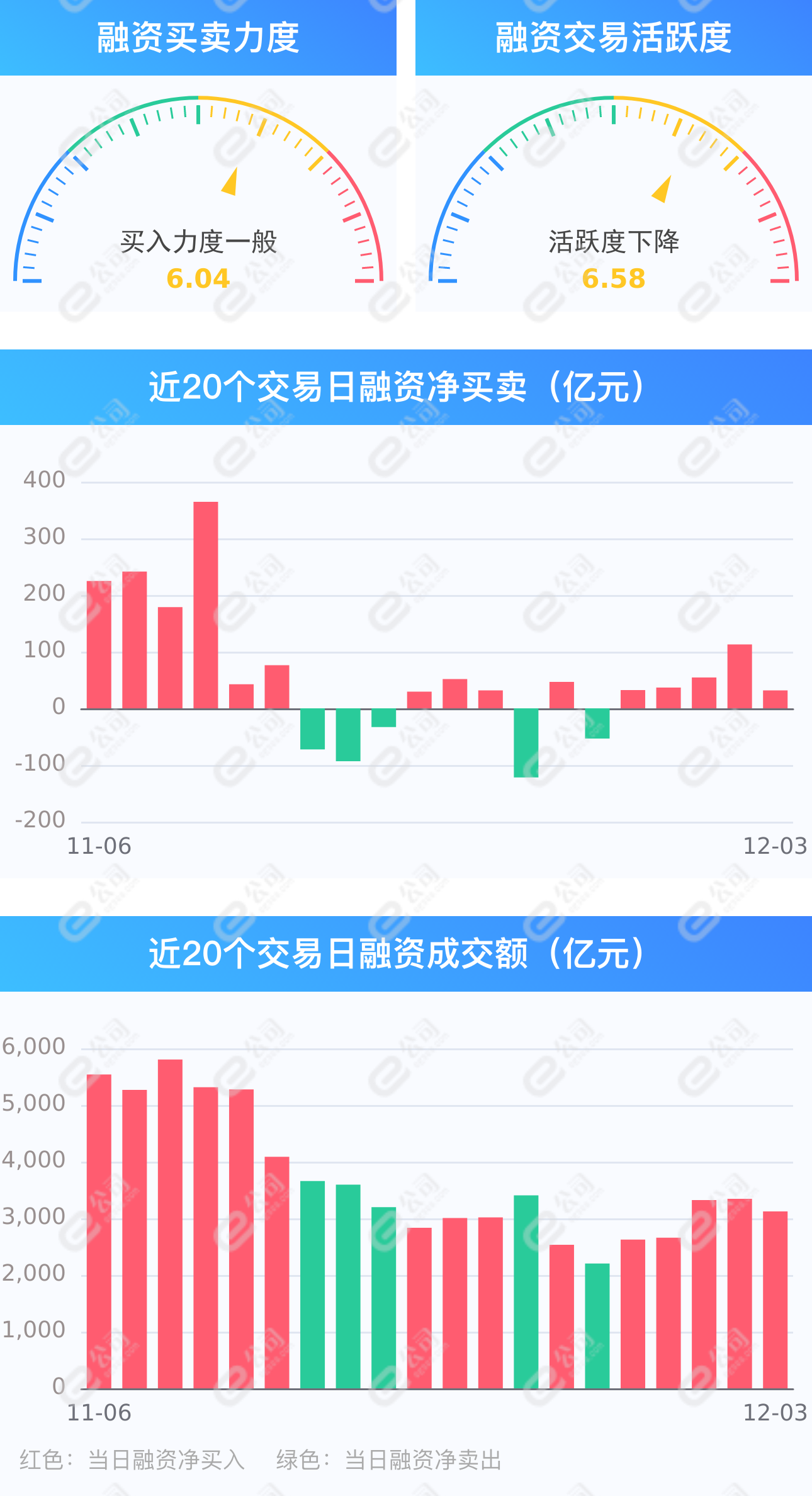 e公司讯,截至12月3日,上交所融资余额报9496.11亿元,较前一交易日增加1.97亿元;深交所融资余额报8948.28亿元,较前一交易日增加29.61亿元;两市合计18444.39亿元,较前一交易日增加31.57亿元,融资交易额3120.90亿元,占A股成交额18.19%,其中融资买入额1576.23亿元,融资偿还额1544.66亿元,交易活跃度下降6.70%。统计发现,融资客保持连续5日净买入,净买入额分别为32.12亿元、36.71亿元、54.52亿元、112.80亿元、31.57亿元,合计267.71亿元。