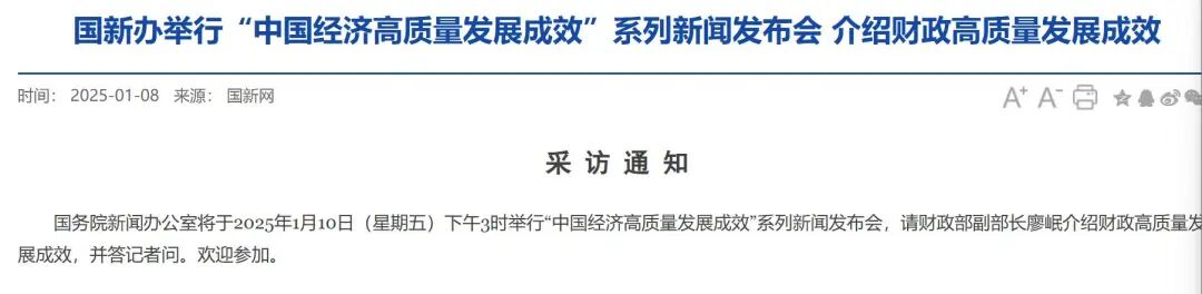 国务院新闻办公室定于2025年1月10日(星期五)下午3时举行“中国经济高质量发展成效”系列新闻发布会,请财政部副部长廖岷介绍财政高质量发展成效,并答记者问。