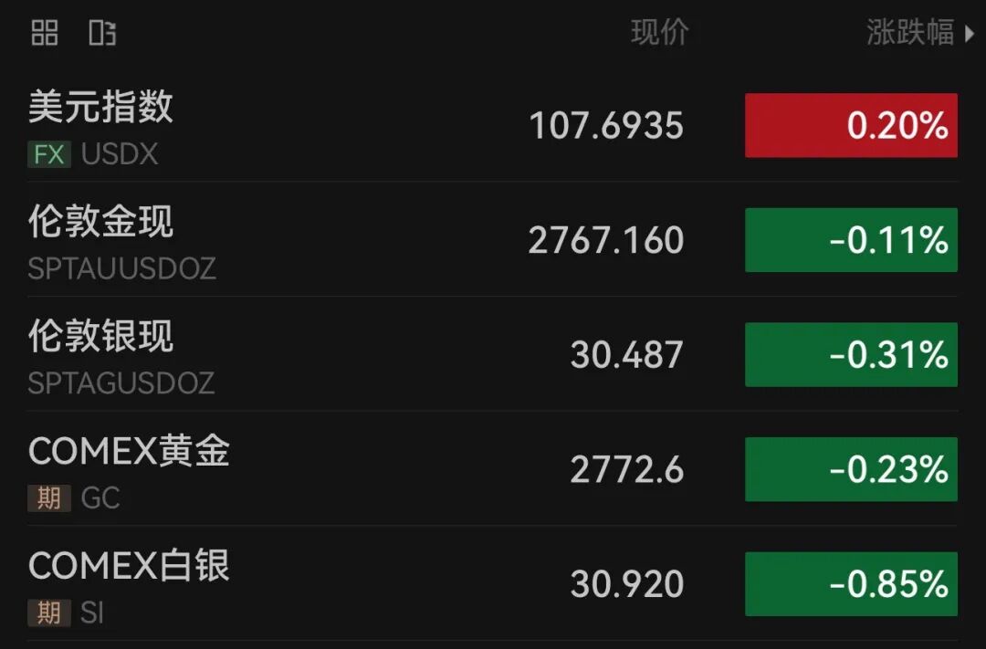 现货黄金周一开盘一度下跌5美元,现报2767.16美元/盎司;现货白银开盘跌逾0.3%,现报30.487美元/盎司。现货钯金日内跌超2.00%,现报974.34美元/盎司。