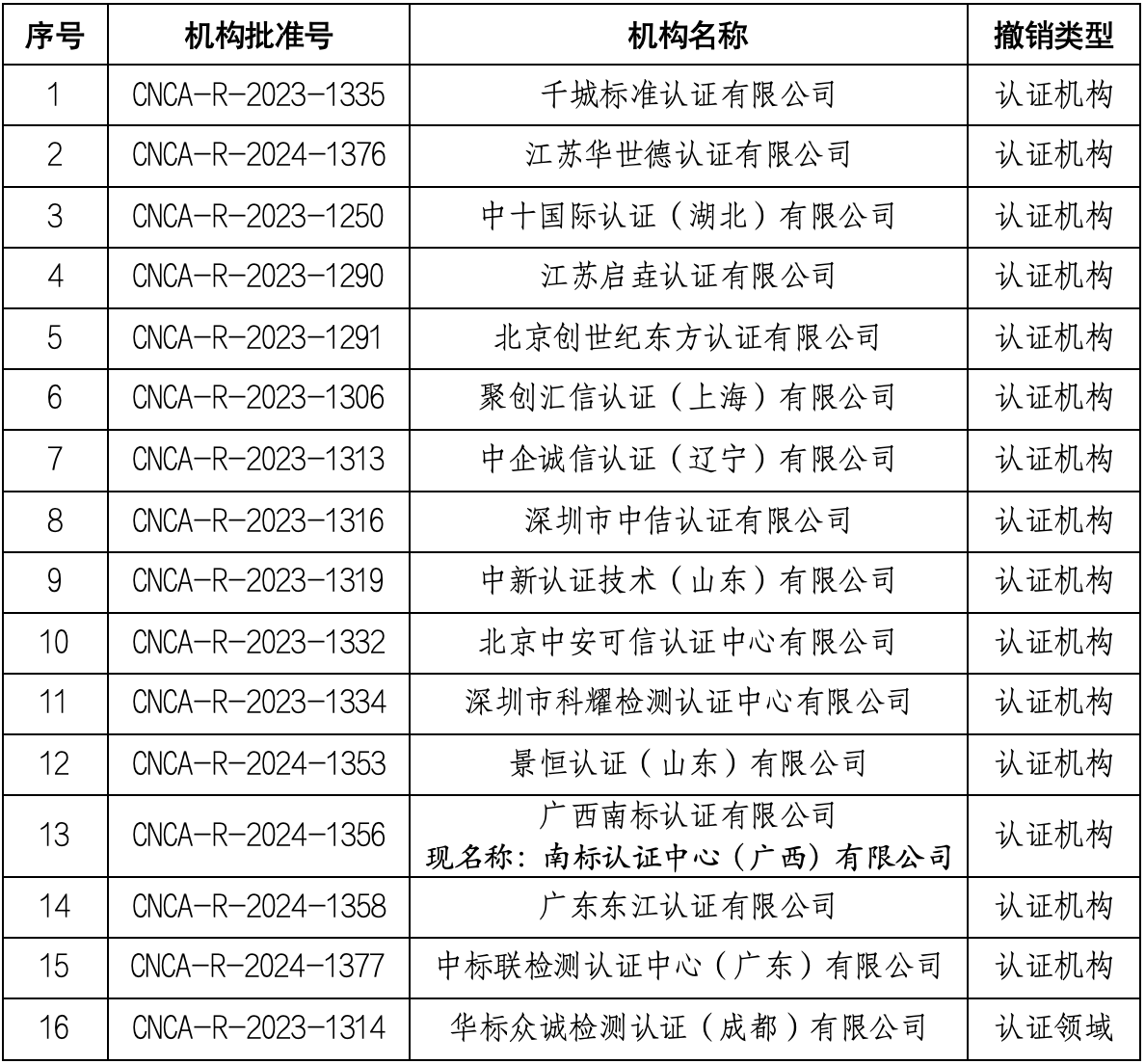 e公司讯,据市场监管总局消息,近日,国家认监委在2024年度认证机构资质符合性现场核查工作中,发现千城标准认证有限公司等16家认证机构存在提交虚假材料取得认证机构资质、不具备或不能持续符合认证机构资质条件和能力的问题。依据《中华人民共和国行政许可法》第六十九条、《认证机构管理办法》第三十一条有关规定,决定撤销16家认证机构批准资质和业务领域。