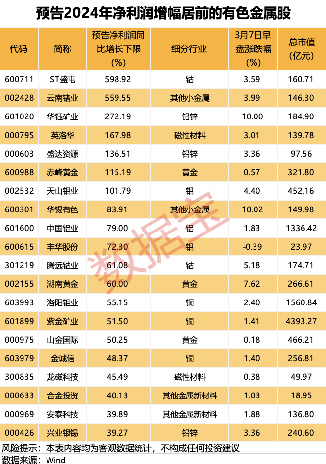 以预告净利润同比增长下限来看,业绩预增的上市公司中,ST盛屯、云南锗业、华钰矿业等7股预计增幅超100%。