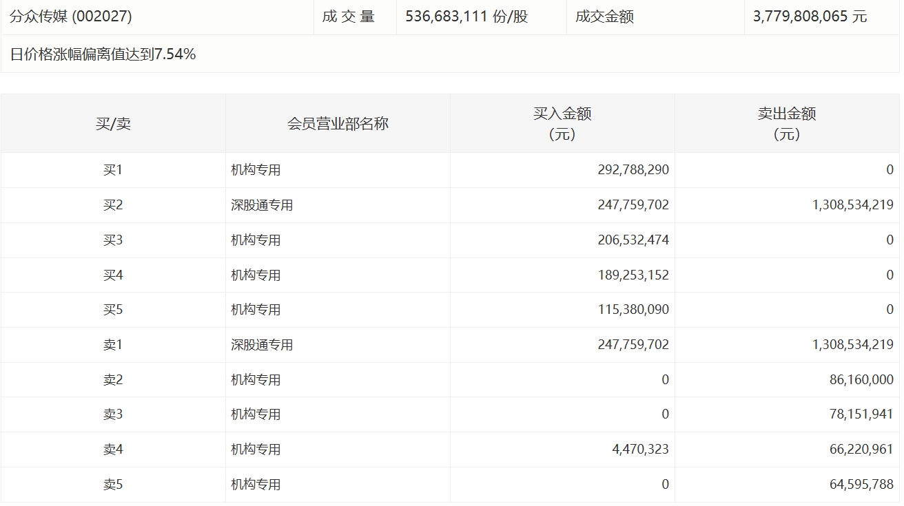 人民财讯4月10日电,分众传媒今日涨停,成交额37.8亿元,换手率3.72%。盘后龙虎榜数据显示,深股通专用席位买入2.48亿元并卖出13.09亿元,四机构专用席位净买入8.04亿元,四机构专用席位净卖出2.91亿元。