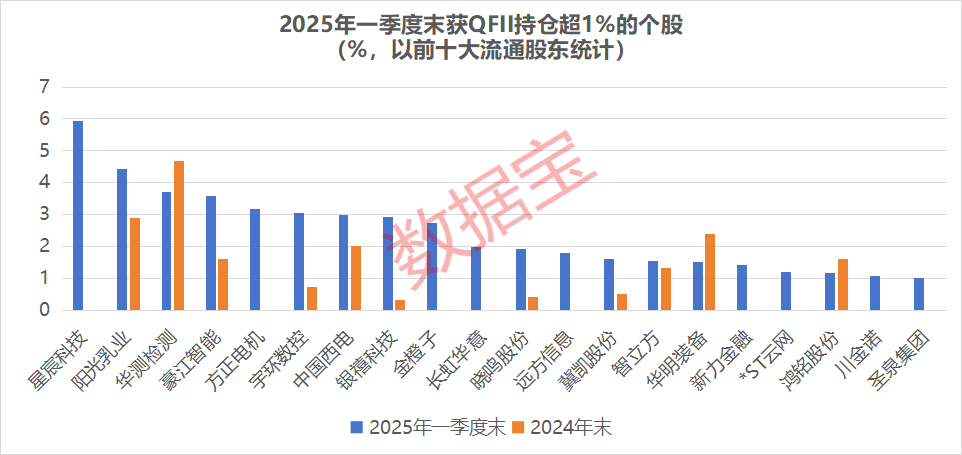从2025年一季度末QFII的持仓比例来看,截至2025年4月20日,45股前十大流通股东均有QFII身影,其中20股获持仓超1%,星宸科技、阳光乳业、华测检测等7股持仓超过3%。
