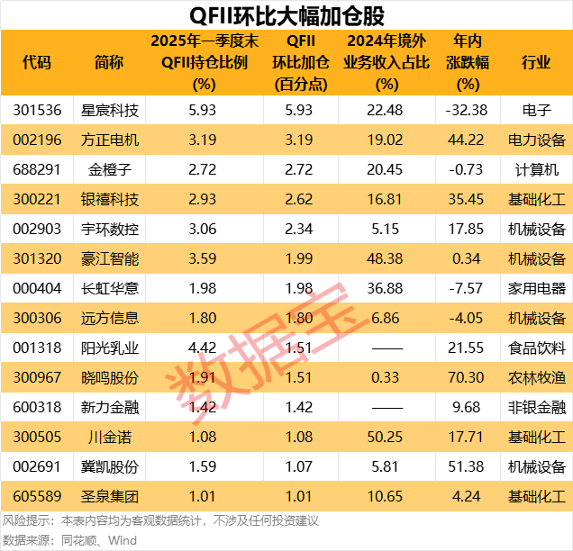 进一步来看,上述45股中,QFII 2025年一季度末持仓比例较2024年末加仓的个股多达38只,占QFII持仓个股数量比例超过八成,其中机械设备、基础化工及电力设备公司居多。14只个股加仓幅度超过1个百分点,包括星宸科技、方正电机、金橙子、宇环数控等。