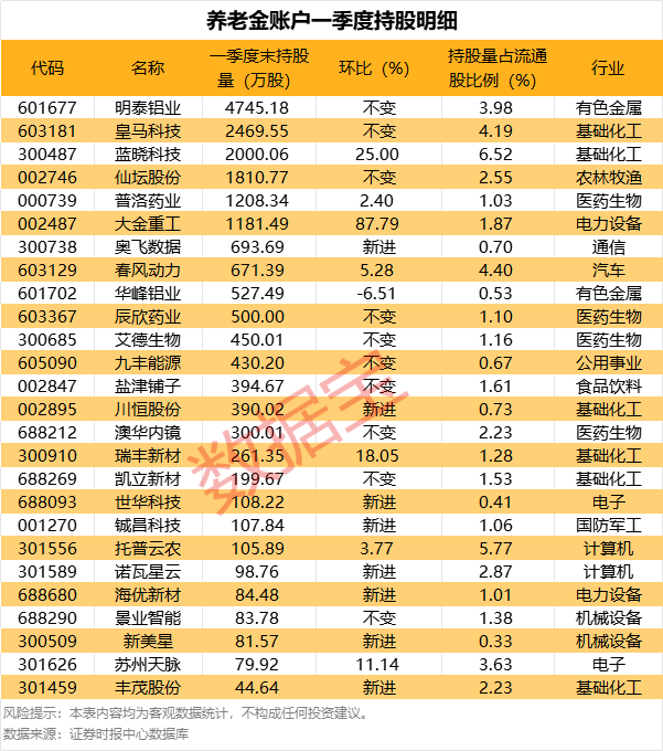 一季度末养老金账户对明泰铝业的持股量最多,持股量4745.18万股;其次是皇马科技,持股量2469.55万股。