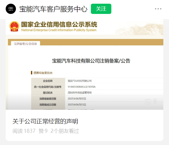 6月17日,宝能汽车客户服务中心微信公号发布声明称,近期,有部分媒体歪曲事实,恶意报道公司及关联公司发布了解散、清算公告,扰乱了网络秩序,侵害了公司的合法声誉。