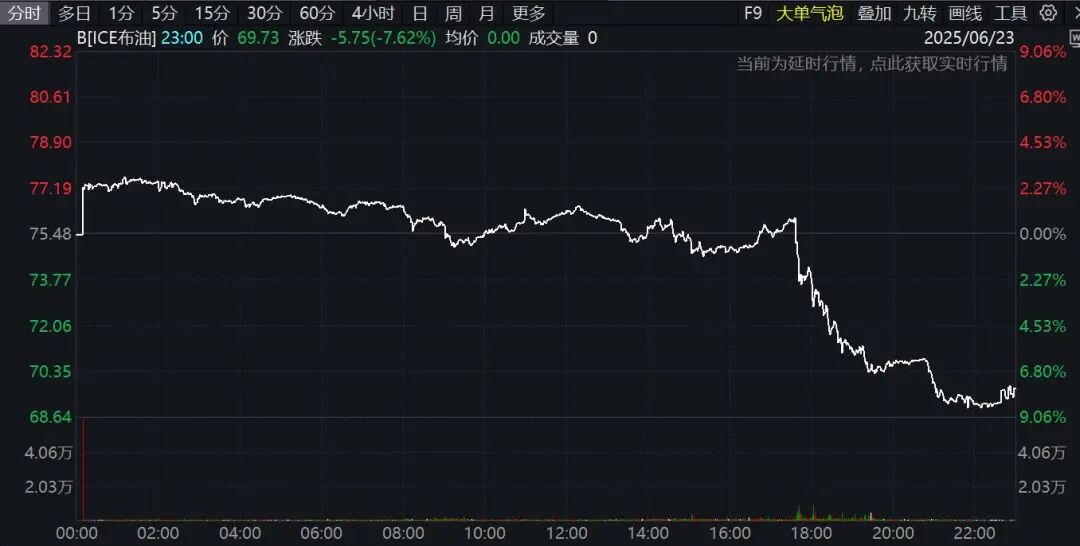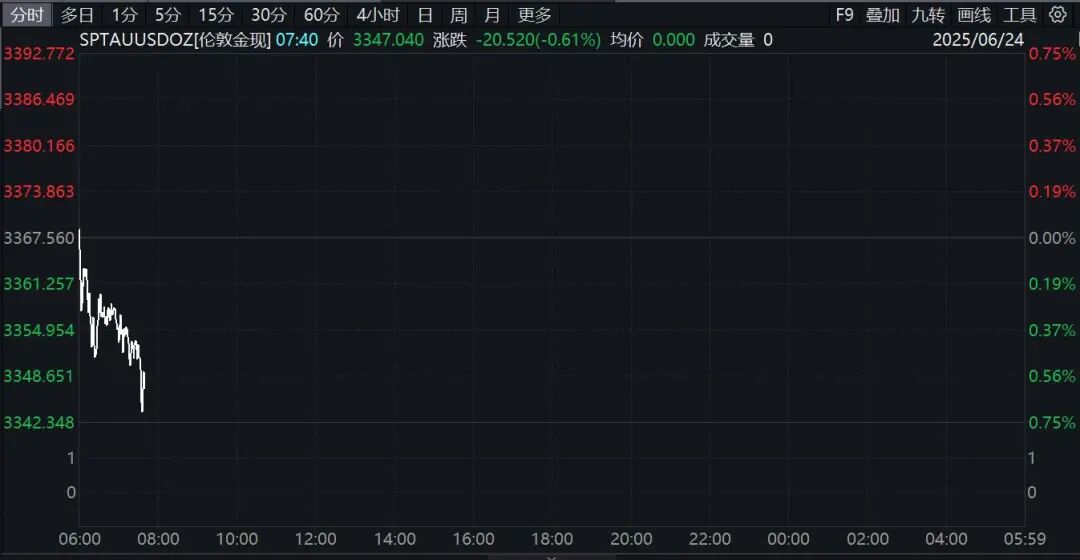 中东局势缓和,6月24日亚市盘初原油暴跌,美国WTI原油期货一度跌逾6%,现货黄金跳水。