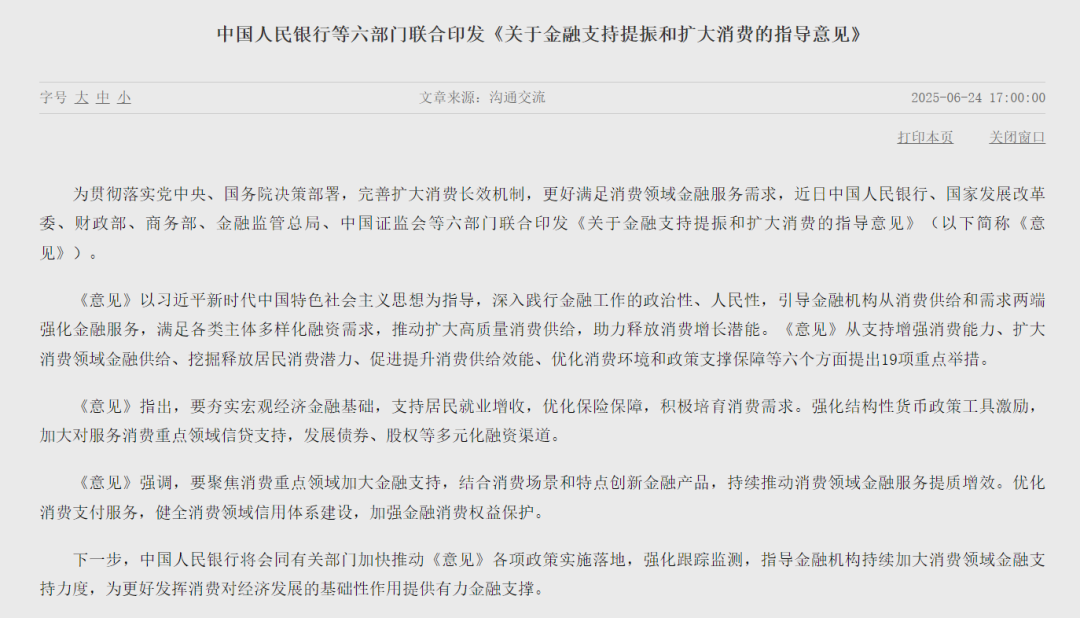 近日,中国人民银行、国家发展改革委、财政部、商务部、金融监管总局、中国证监会等六部门联合印发《关于金融支持提振和扩大消费的指导意见》(以下简称《意见》)。