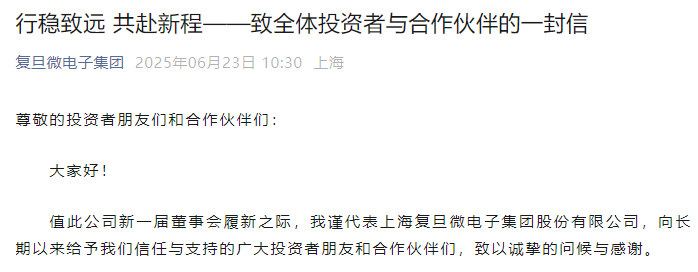 在经历换届分歧,新一轮董事会成员及高管班子落定后,复旦微电新任董事长兼总经理张卫近日发了封公开信。