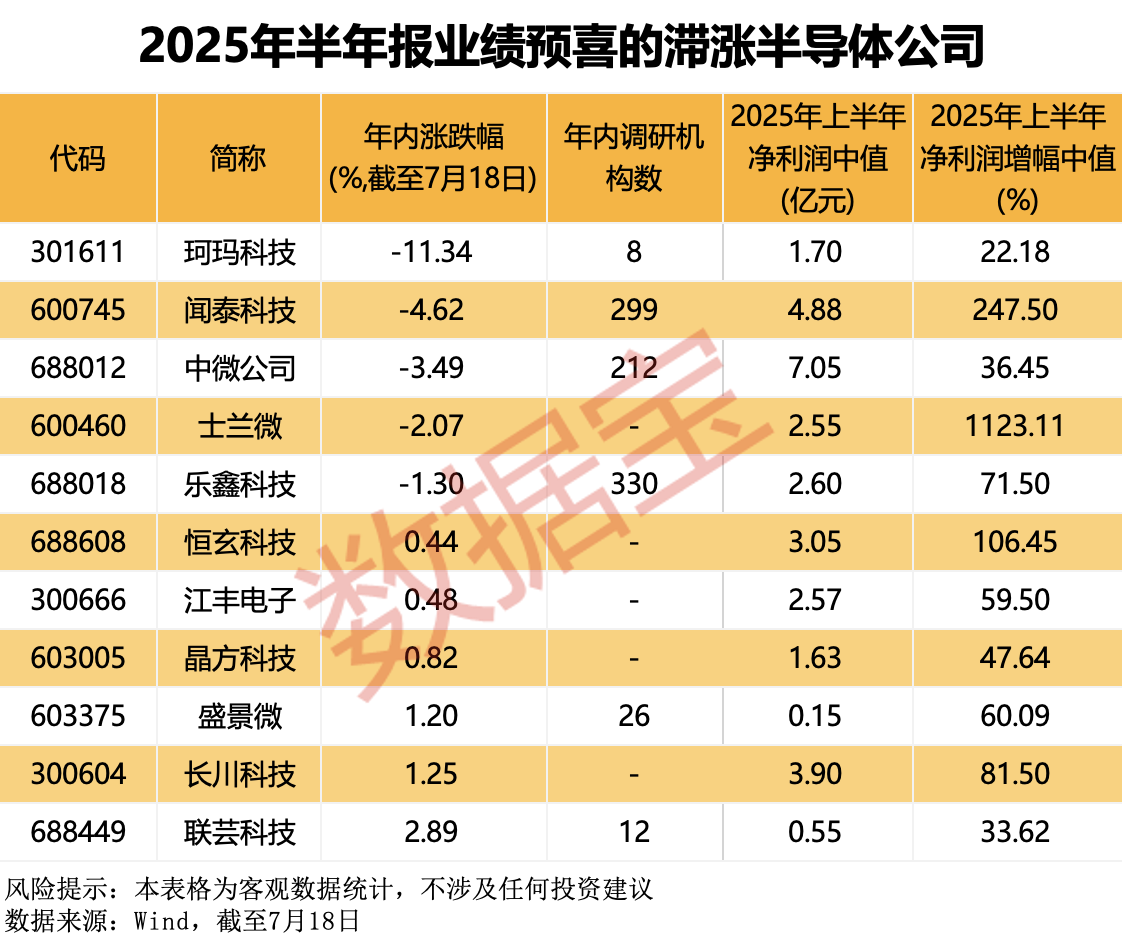 从市场表现来看,截至7月18日,30余家披露2025年半年报预告的半导体公司,年内平均涨幅接近15%,大幅超越未披露半年报预告的半导体公司的平均涨幅(5.97%)。